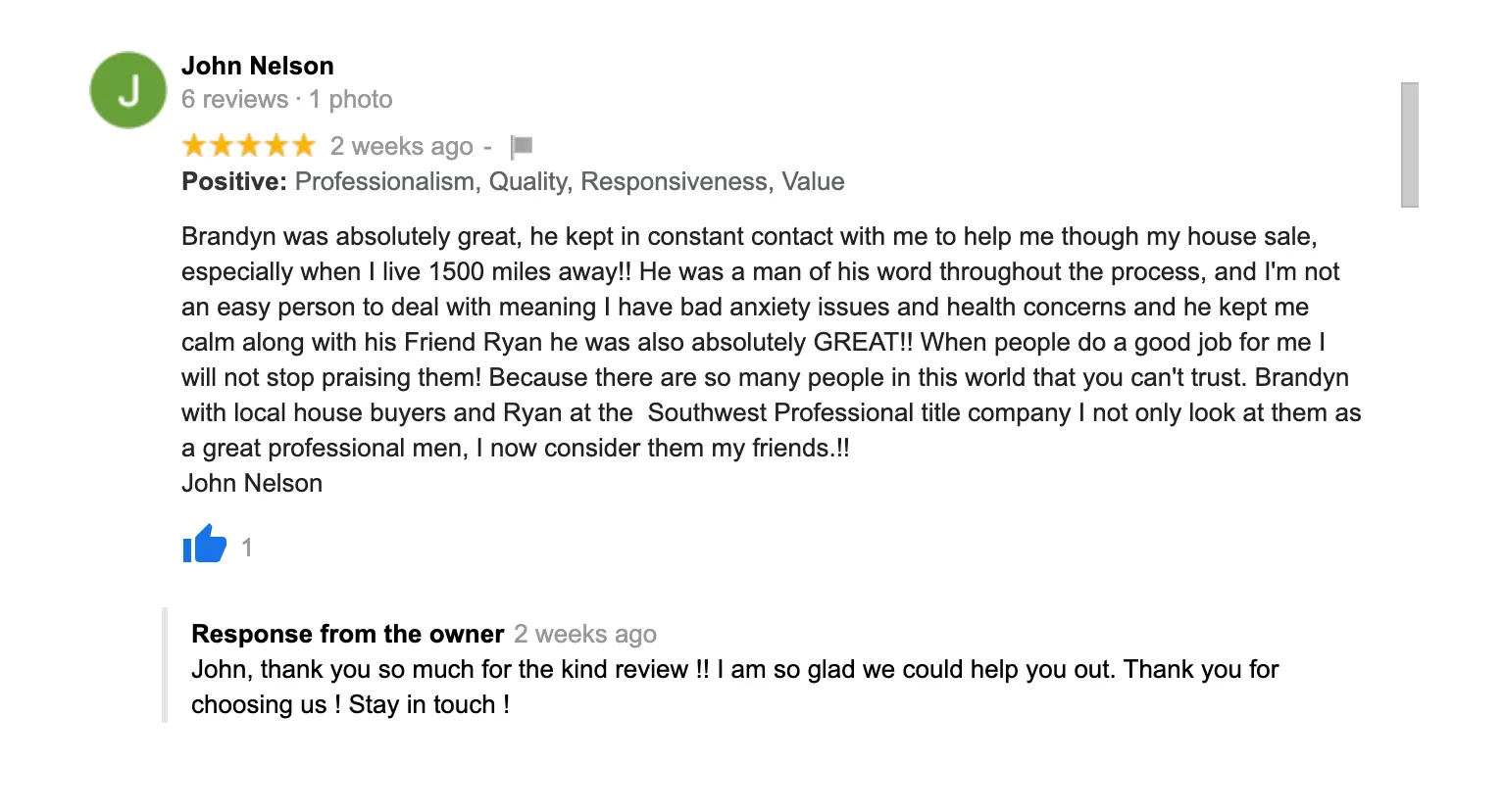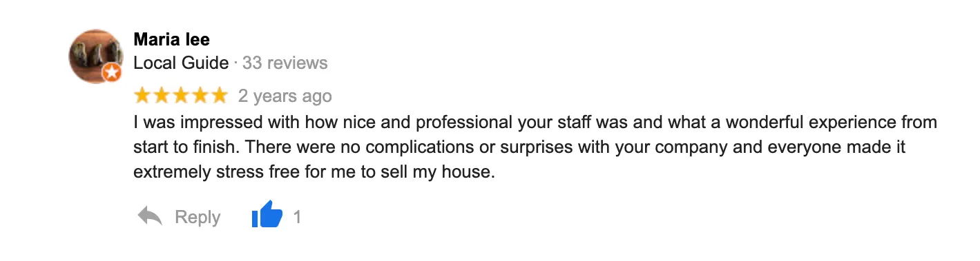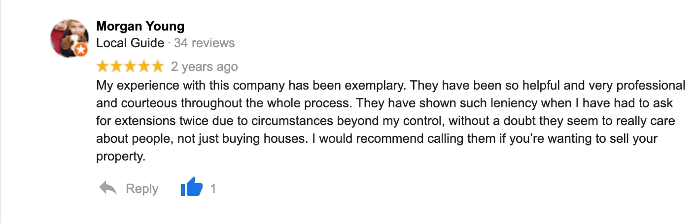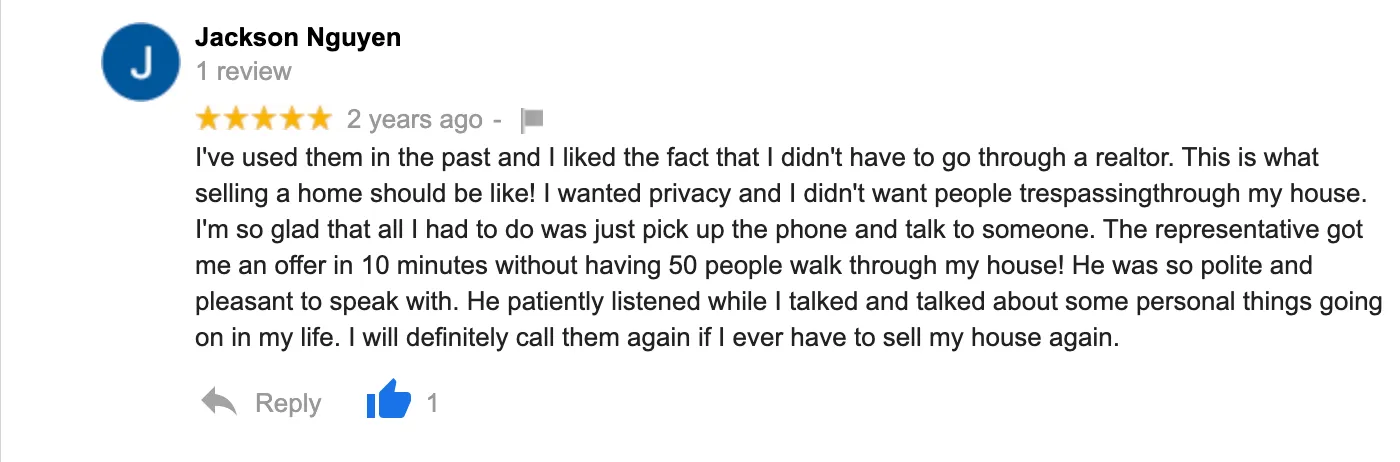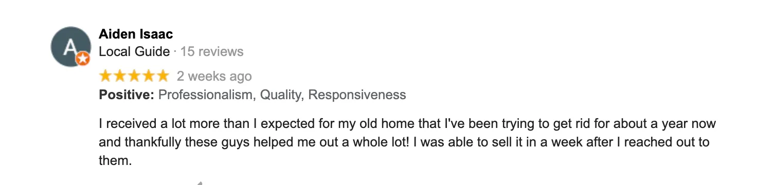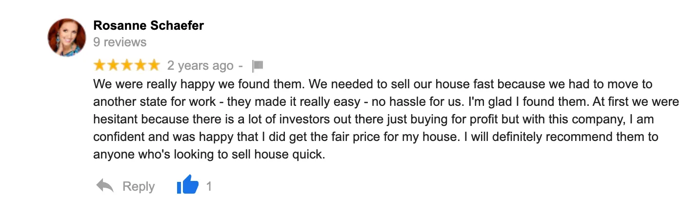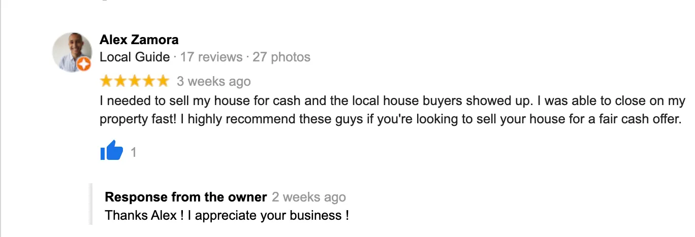 “Great Job!! The Local House Buyers were always available when I had questions. They were always professional and above all they got the job done. Originally, I started with a different company who never had the time for me. I couldn’t be happier with the outcome and I just want to send out a big thank you to all the employees for all their hard work. Highly Recommend!!